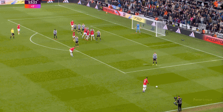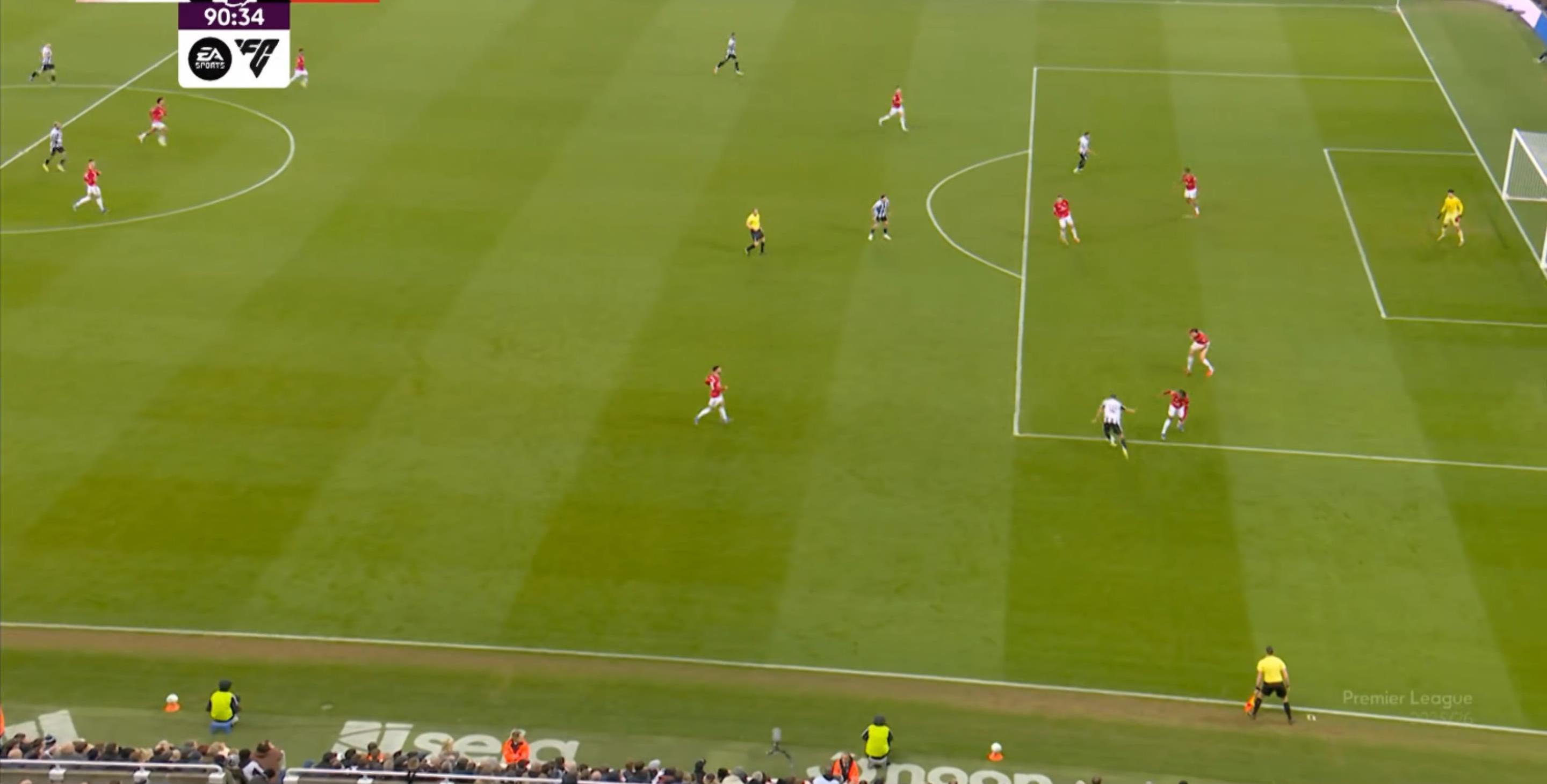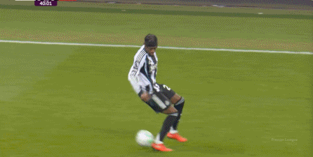 随后,已经少打一人的纽卡补上一点劣势,戈登先从卡塞米罗脚下断球,然后回到熟悉的左边路,成功制造了点球,并且顺利罚中: