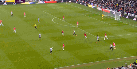 到了30分钟前后,纽卡斯尔的强度出现了一定程度的下降,他们在中场区域的对抗和跑动优势不再像开局阶段那么明显,球权易手的频率也因此增加,曼联因此打出了一些内容,比如在前锋线的牵制下,布鲁诺在脱离前腰位置之后用肋部区域传中来联系前锋,这次便找到了谢什科和库尼亚,形成了一次门前的进攻: