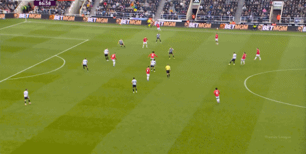 所以,当你的进攻端并不能自主成型,也无法等待对手强度大幅回落的情况下,曼联在上半场的进攻就显得有一搭没一搭了,比如球队的第一次进攻,来自前场抢断后打飞的远射: