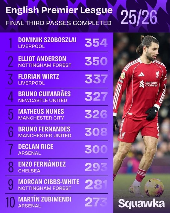 pg电子官网-英超进攻三区成功传球榜:索博居首 维尔茨、B费、赖斯、恩佐在列